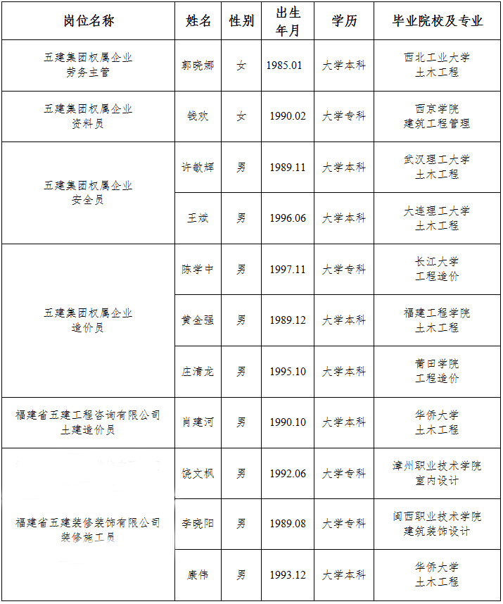 福建五建集團(tuán)2025年第二批項(xiàng)目制招聘擬錄用人員名單公示